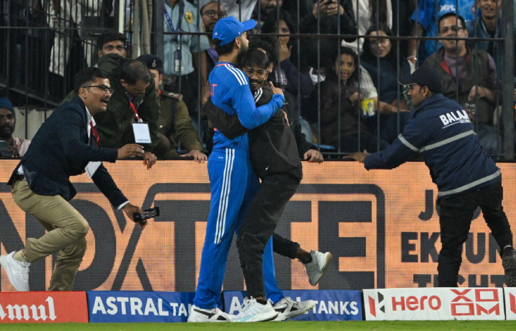 इंदौर पुलिस ने एक युवक को उस वक्त हिरासत में ले लिया, जब वह सुरक्षा का उल्लंघन कर होल्कर के क्रिकेट स्टेडियम के मैदान में घुस गया और स्टार बल्लेबाज विराट कोहली को गले लगाने की कोशिश करने लगा। घटना के दौरान, विराट कोहली बाउंड्री रोप के पास फील्डिंग कर रहे थे, तभी उस शख्स ने सुरक्षा बैरिकेड को पार करने का प्रयास किया और मैदान में घुस गया। सुरक्षाकर्मियों ने तेजी से अतिक्रमणकारी को मैदान से बाहर निकाला।